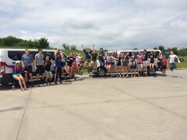 We stopped for lunch at noon in Iowa where we had a “decorate the van” contest. Both vans did so well with their decorations, it seemed like a shame to pick only one winner. We were so proud of our designs we had a get a group photo in the parking lot. As you can see, timing a jump-shot with 26 people isn’t the easiest task.