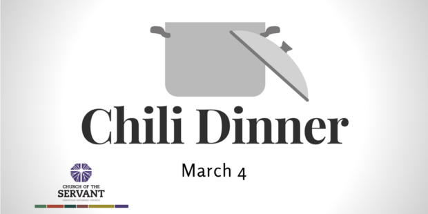 Join us Sunday, March 4 for an all-church chili dinner immediately following our morning worship services. Ellen will make the chili, but the other food will be potluck-style, so please bring a dish to share.