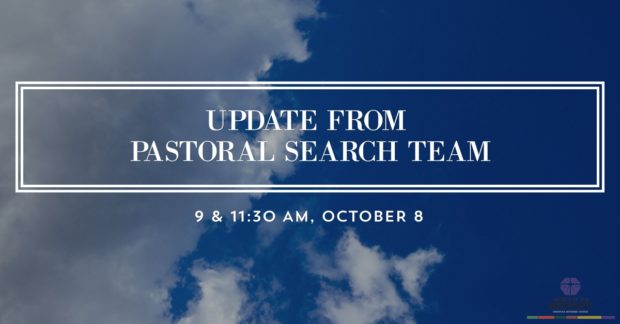 At both 9 am & 11:30 am next Sunday, Oct. 8, the adult education sessions will be led by members of the Pastoral Search Team. The team will review the steps in the discernment process they have gone through so far, explain where things stand today, and give a preview of what lies ahead and what the conclusion of the search and calling process could look like. Although the search process remains confidential at this stage, there will be an opportunity for general questions and answers. We invite you to come and engage with the team in room 5.